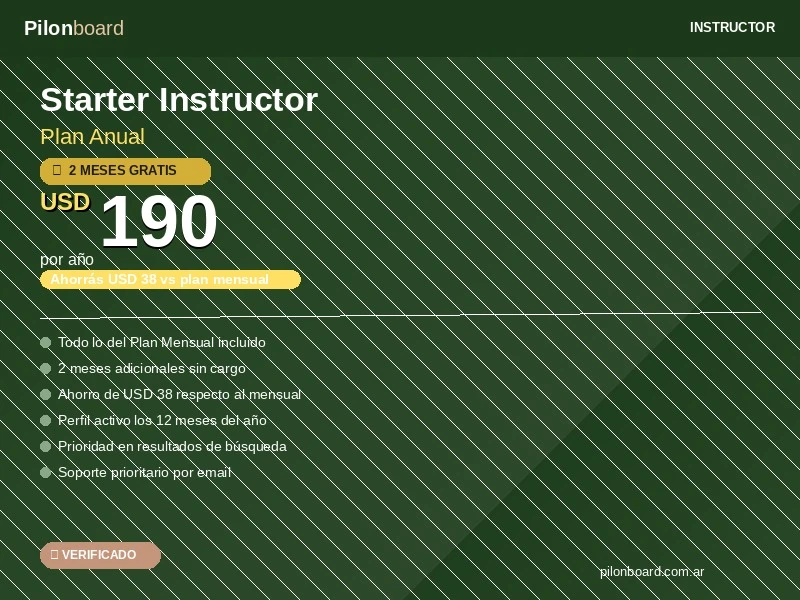 Todo el plan mensual con 2 meses gratis incluidos. La mejor opción para instructores que quieren maximizar su visibilidad anual. Ahorrás USD 38.